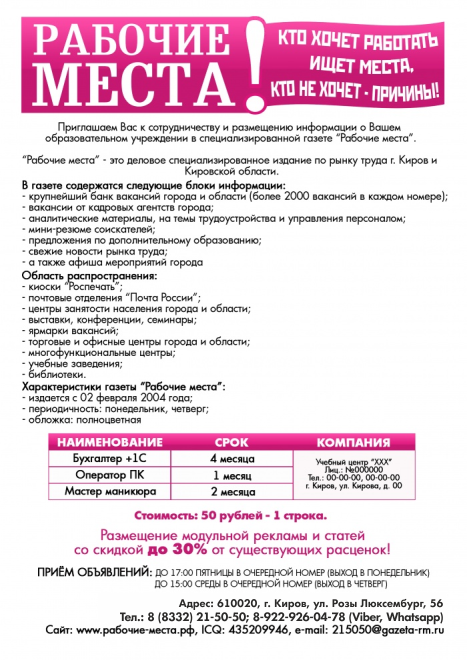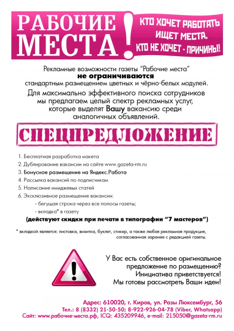 За время сотрудничества сложилось такое ощущение, что газета «Рабочие места» всегда находится «на расстоянии вытянутой руки». С менеджерами легко связаться, издание вовремя доставляется, а главное наши пожелания по размещению, размерам, содержанию объявления выполняются безукоризненно.