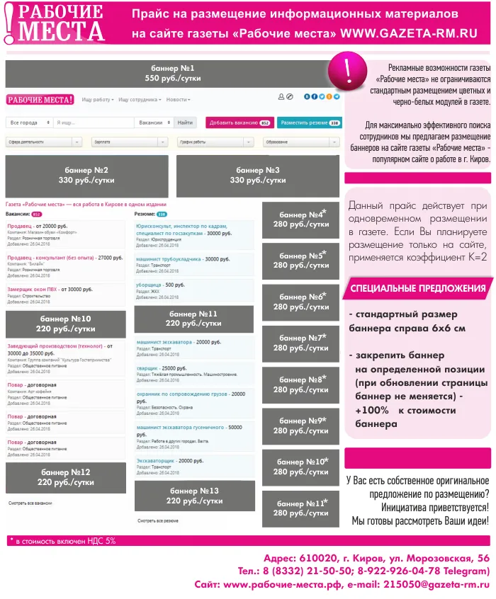 При подаче объявления в газету «Рабочие места» ваша информация одновременно будет: