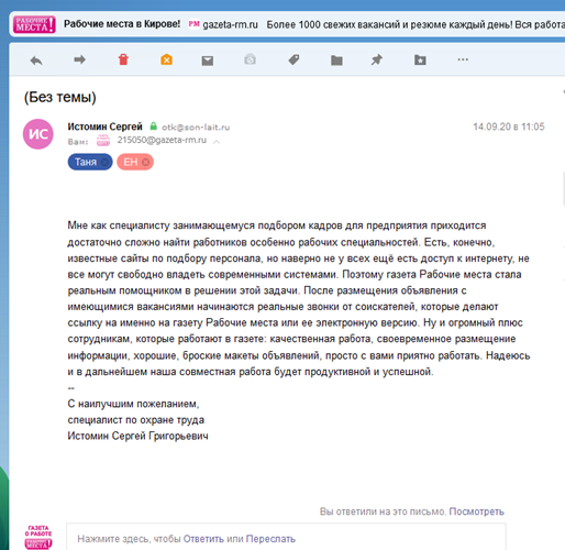 Поэтому газета Рабочие места стала реальным помощником в решении этой задачи. После размещения объявления с имеющимися вакансиями начинаются реальные звонки от соискателей, которые делают ссылку на именно на газету Рабочие места или ее электронную версию. Ну и огромный плюс сотрудникам, которые работают в газете: качественная работа, своевременное размещение информации, хорошие, броские макеты объявлений, просто с вами приятно работать.